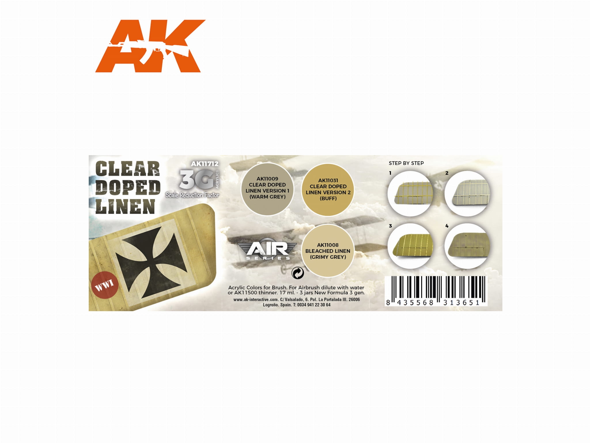 AK Acrylics 3Gen AIRCRAFT SET AK11712 Clear Doped Linen SET 3G (3x17ml)