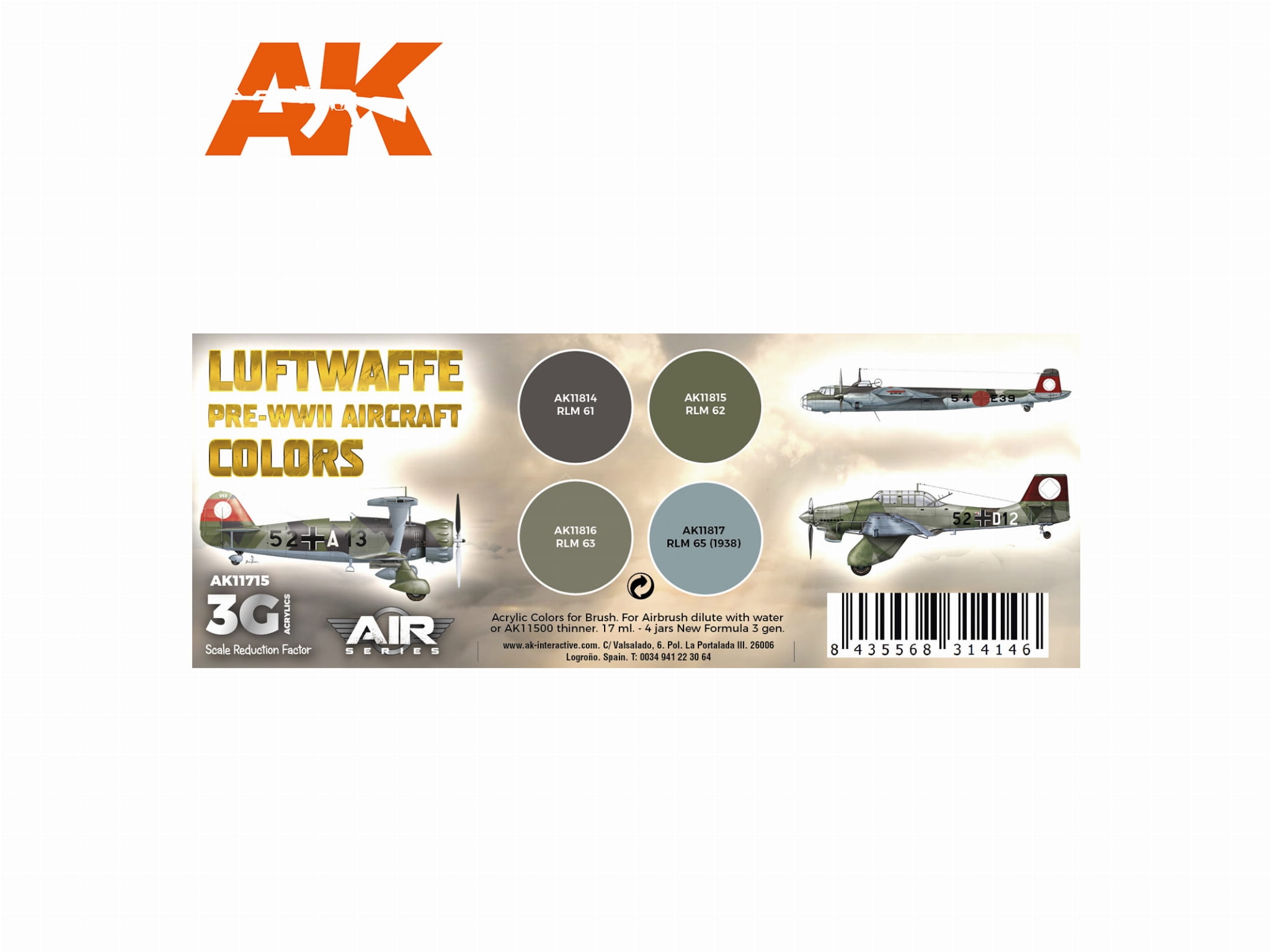 AK Acrylics 3Gen AIRCRAFT SET AK11715 Luftwaffe Pre-WWII Aircraft Colors SET 3G (4x17ml)