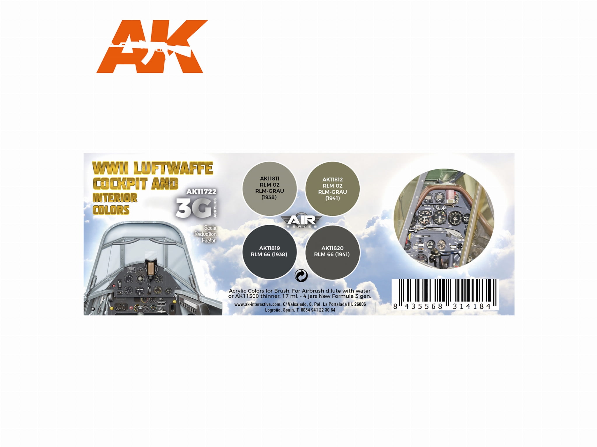 AK Acrylics 3Gen AIRCRAFT SET AK11722 WWII Luftwaffe Cockpit & Interior Colors SET 3G (4x17ml)